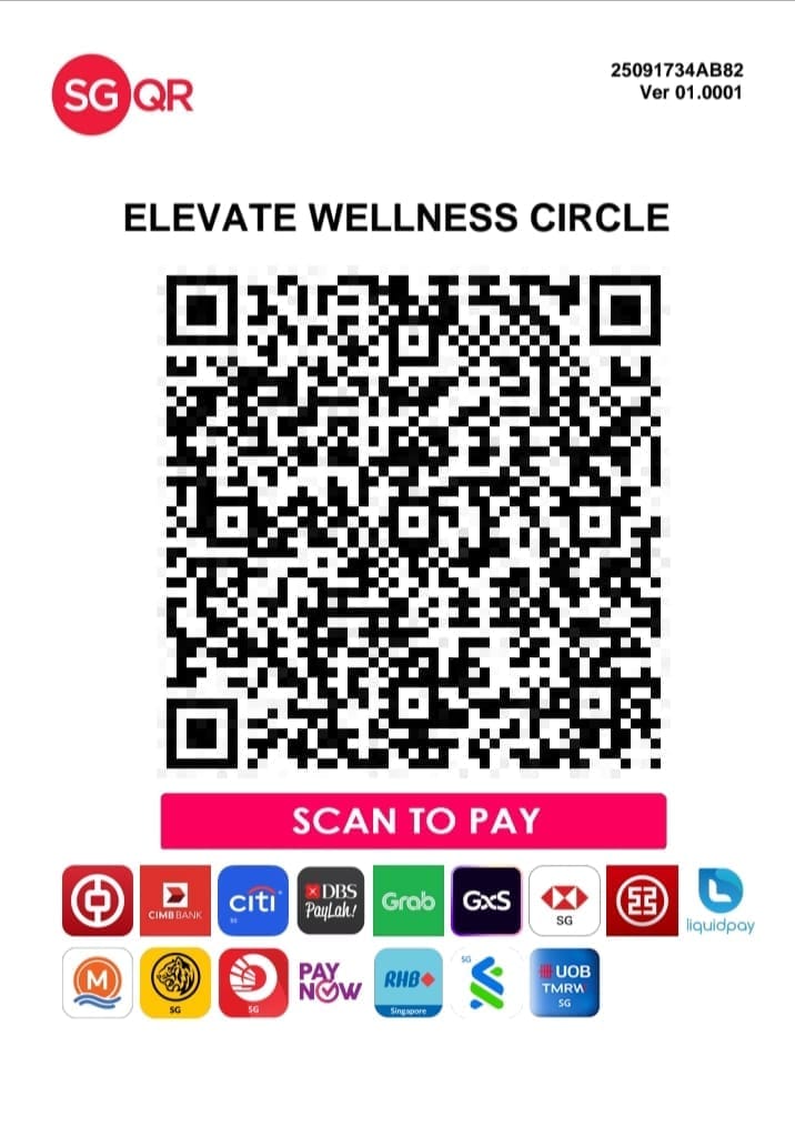 Scan our QR code below or pay to UEN 53508143W (Elevate Wellness Circle).